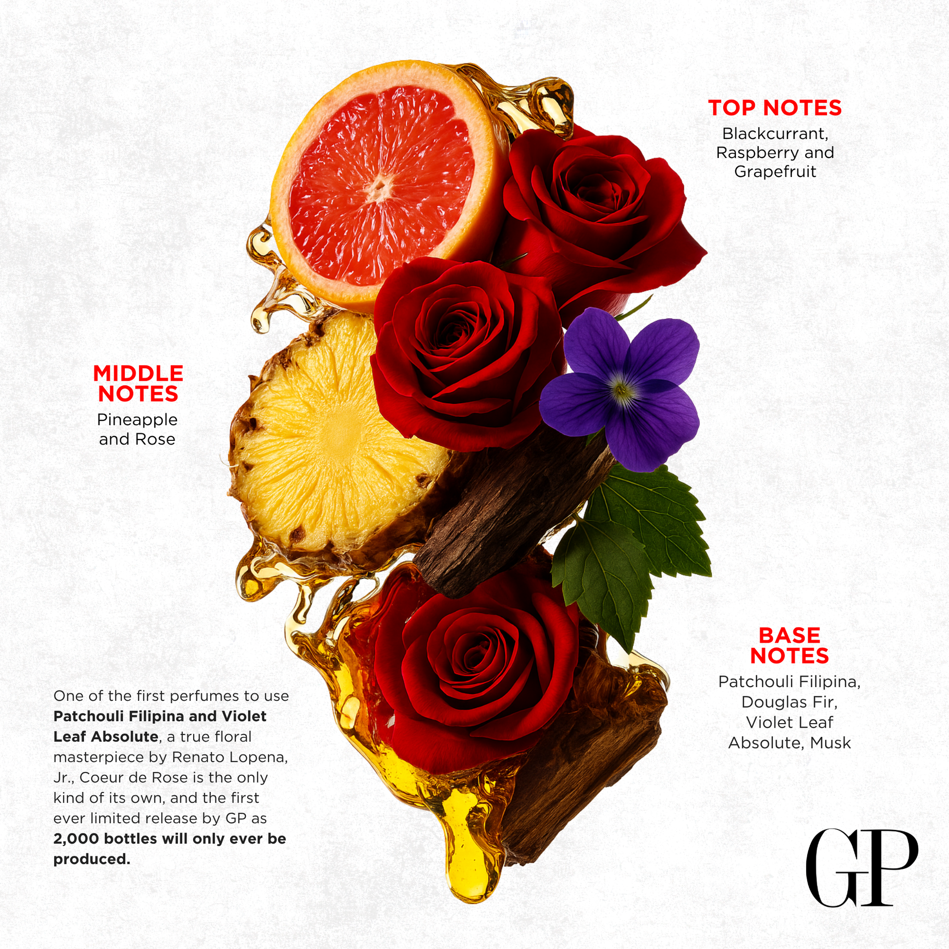 Top Notes: Blackcurrant, Raspberry, and Grapefruit Middle Notes: Pineapple and Rose Base Notes: Patchouli Filipina, Douglas Fir, Violet Leaf Absolute, Musk